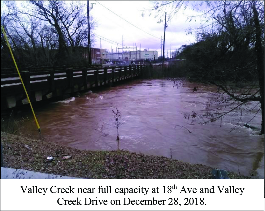 Problem & Need: Valley Creek has a history of frequent river flooding with low warning times with associated depths ranging from 1-6 feet in the Upper Valley Creek watershed overbanks. Notable historic events occurred in April 1979, December 1983, September 2011, and April 2014. Other recent out-of-bank invents include: December 2015, December 2016, April 2017, September 2018, and December 2018. Frequent out-of-bank flooding occurs almost annually posing a potential threat to life safety and causing recurring economic damages. There is a need to achieve reduction to the potential risk of loss of life as well as reduce economic damages due to flooding.